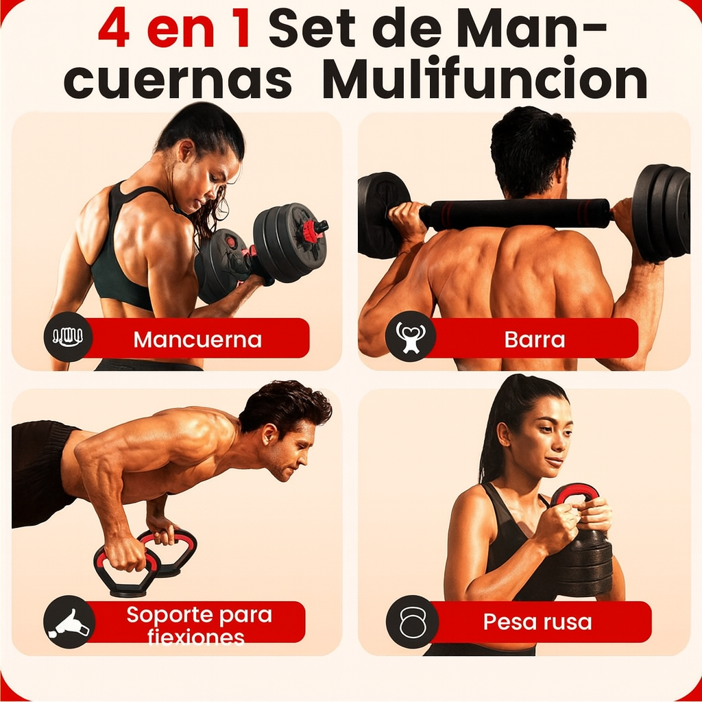 Puedes usarlo como mancuernas, barra, pesa rusa y soportes para flexiones, permitiendo trabajar brazos, pecho, espalda, abdomen, hombros y piernas.