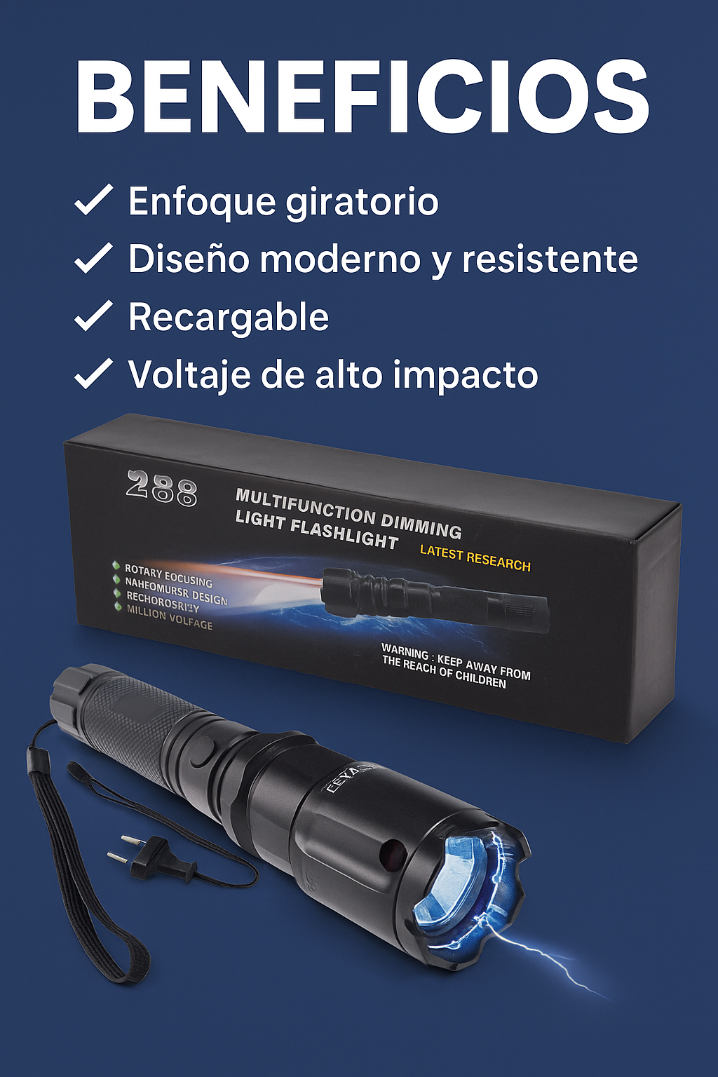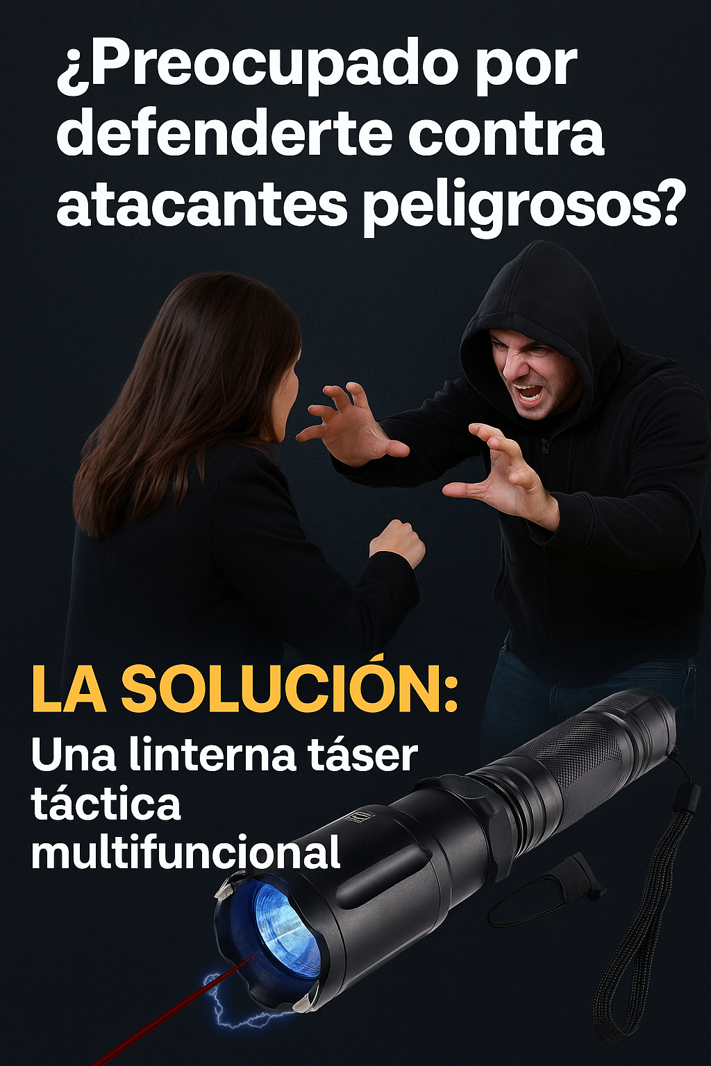 Cuenta con electrodos frontales que emiten una descarga eléctrica de alto voltaje y baja corriente. Esta descarga genera dolor, contracción muscular y desorientación temporal en el agresor, permitiendo al usuario escapar.