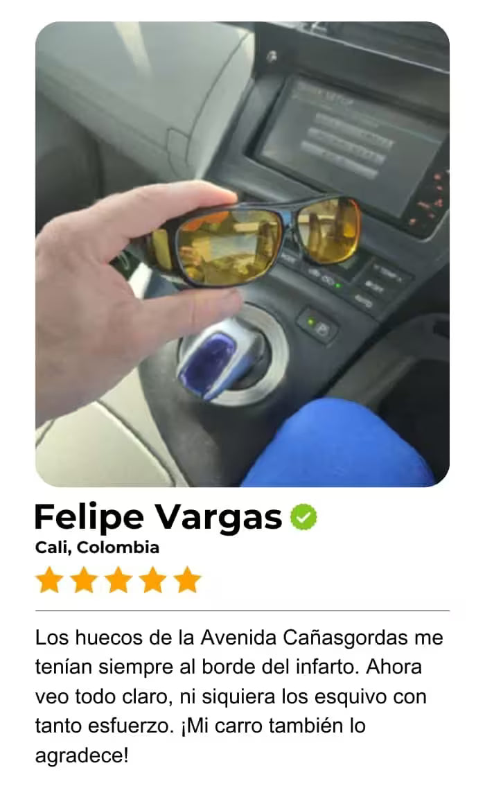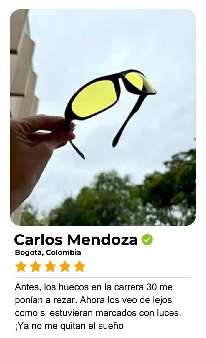 ¿Sabías que los pilotos militares usan lentes amarillos para mejorar su visión en la oscuridad? Las gafas Night Shield™™ aprovechan esta avanzada tecnología, optimizando el contraste y reduciendo la fatiga ocular. Son ideales para mantener una visión nítida y clara durante tus viajes nocturnos, incluso en condiciones de poca luz.