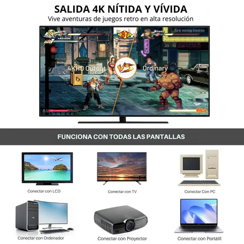 Dependiendo del modelo, puede incluir entre 10,000 y 15,000 juegos retro, organizados por consola y categoría.