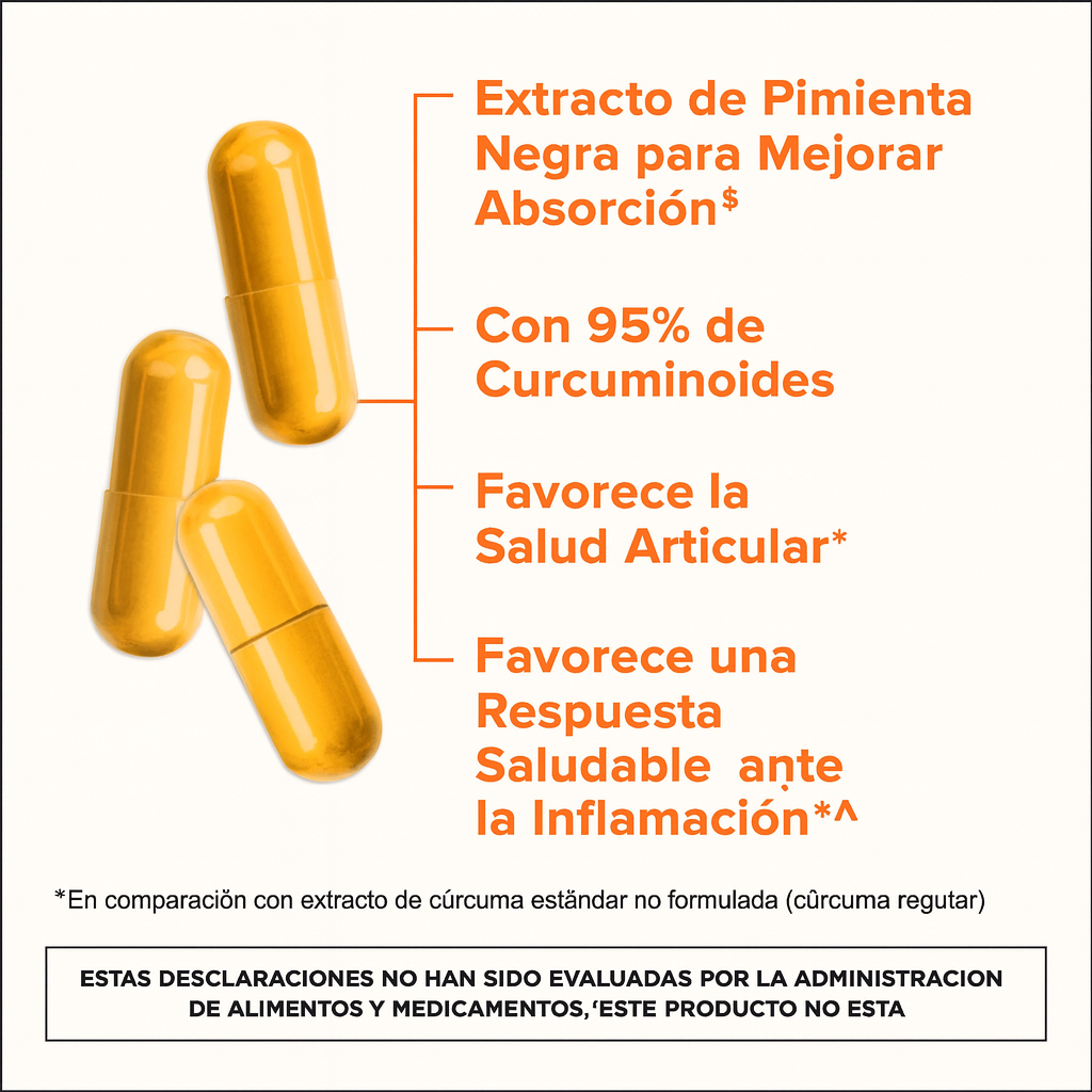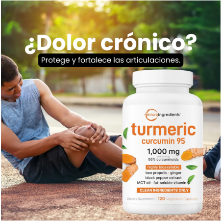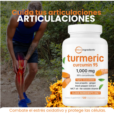 Este suplemento ayuda a reducir la inflamación, mejorar la salud articular, apoyar la movilidad, fortalecer el sistema inmune y mejorar el bienestar general gracias a su alto contenido en curcuminoides y su excelente absorción.