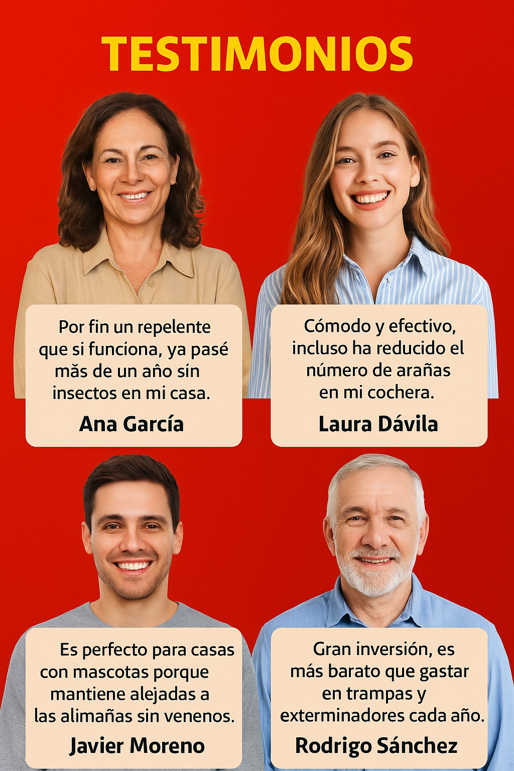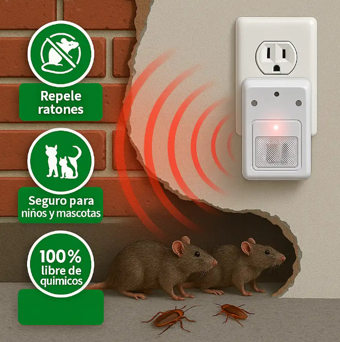 Emite pulsos electromagnéticos que ahuyentan insectos y roedores sin usar químicos.